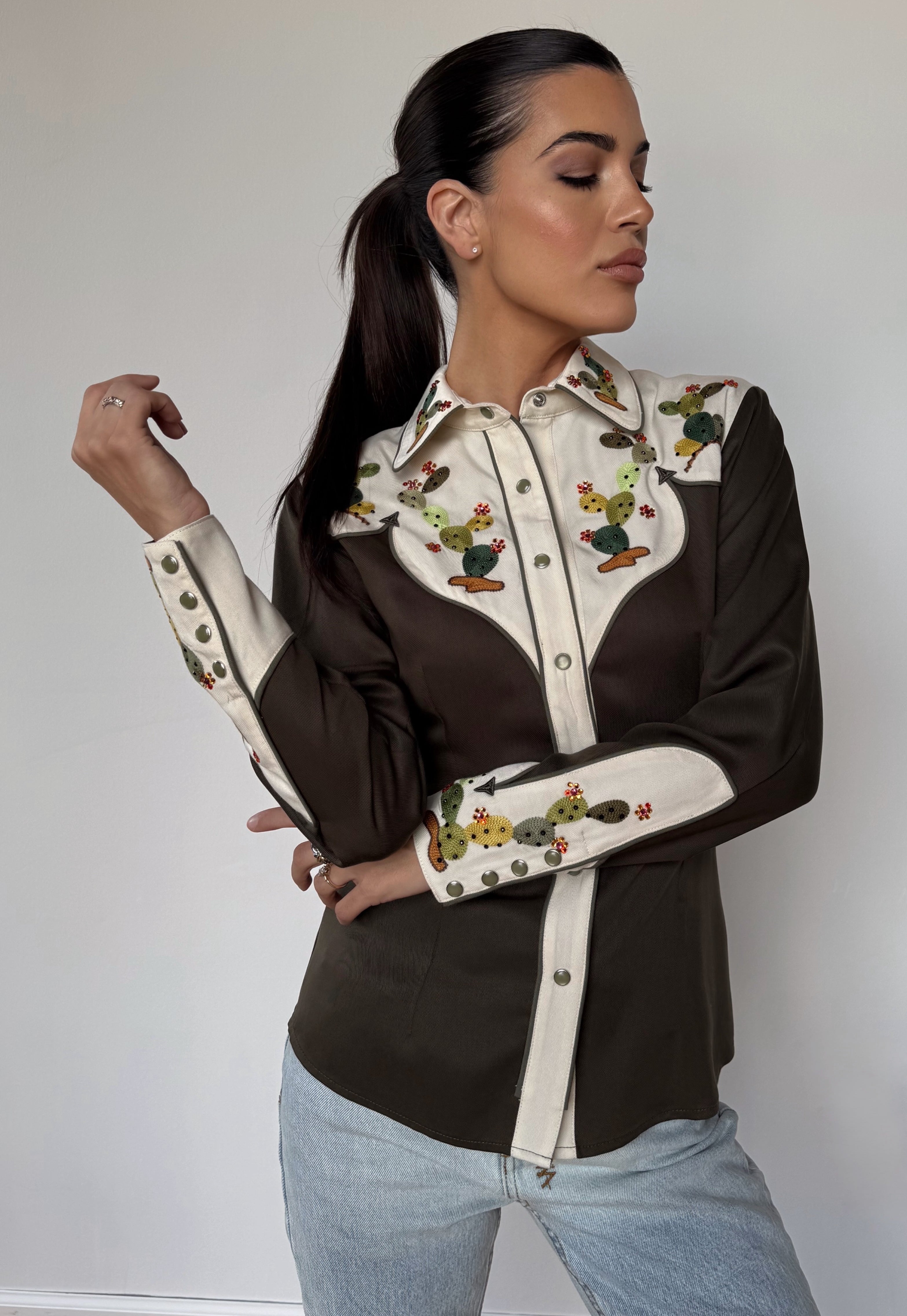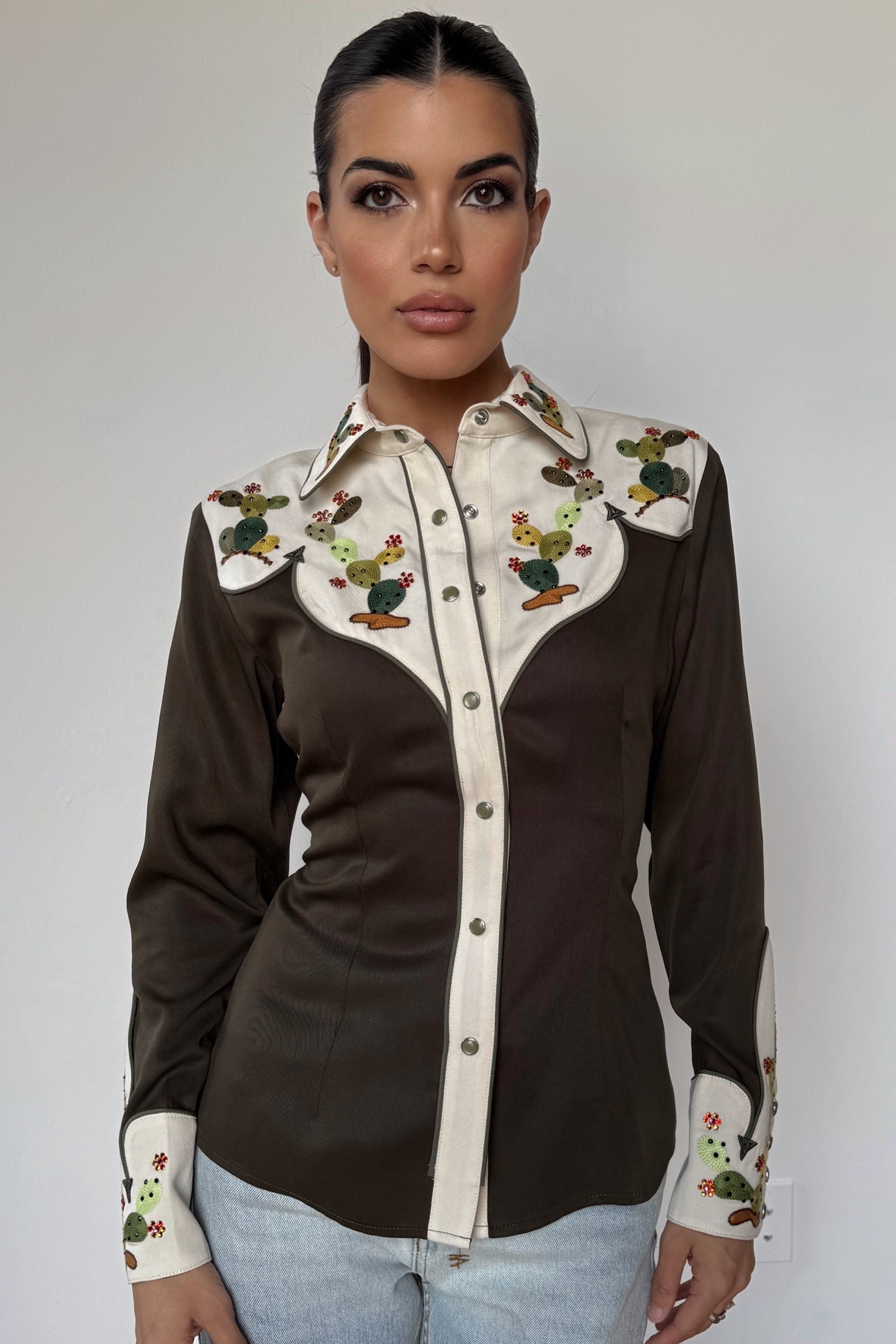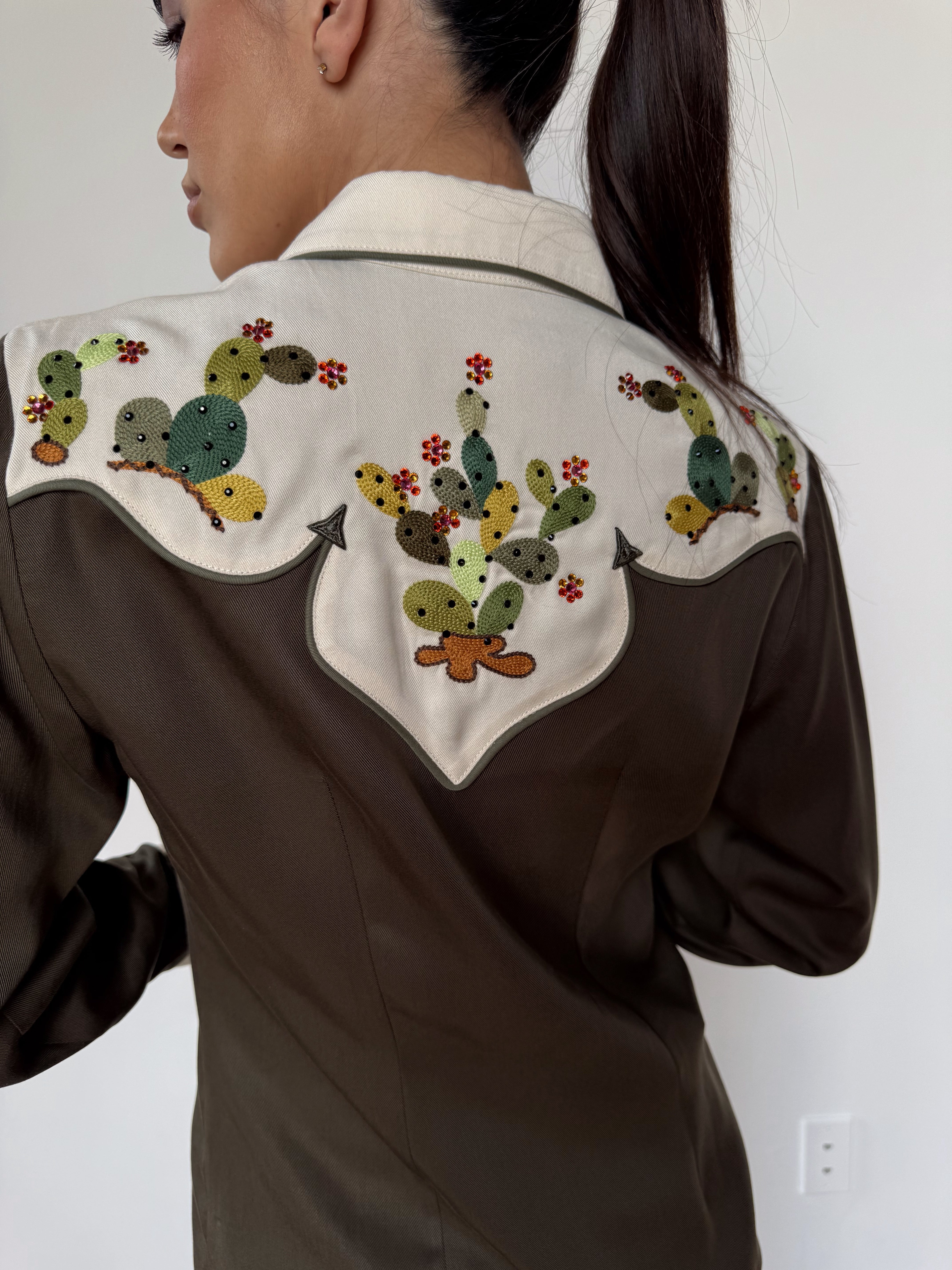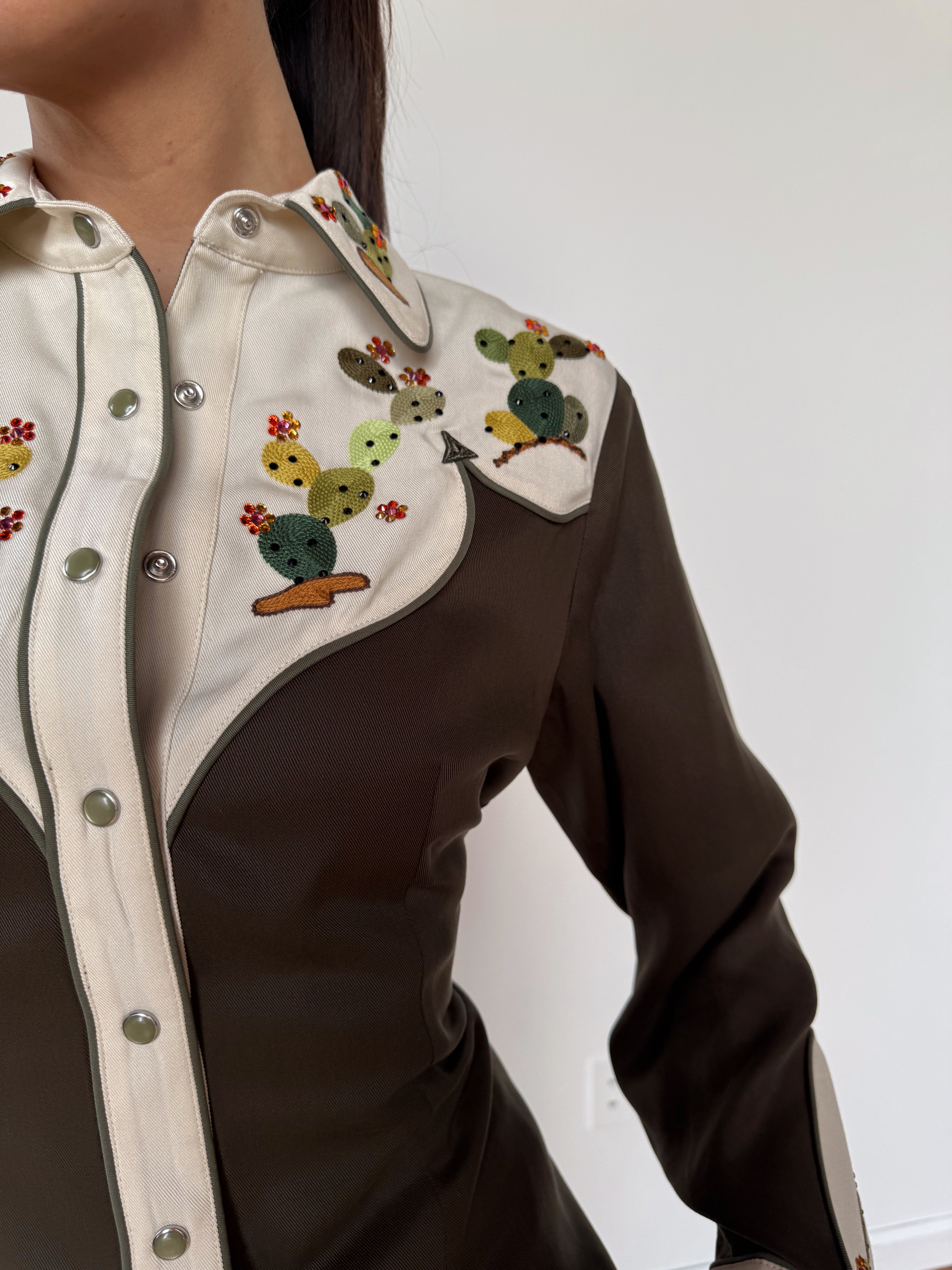 サンノゼ。クラシックな雰囲気を持つウエスタン風のシャツ シルエットとラペルと袖口を囲むサボテンの刺繍。パールボタンとぴったりフィットするサイズを備えたザ サンノゼは、西洋のデザインとロックスターのセンスのバランスが取れています。