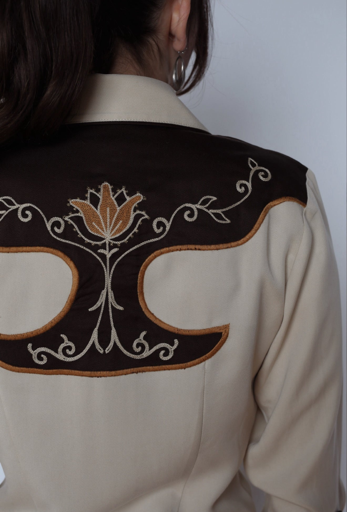 The Santa Barbara shirt is a timeless nod to 1970s Western fashion, reimagined for the modern cowgirl. Crafted from 100% buttery-soft TENCEL, this beige beauty features a rich brown embroidered yoke that adds just the right amount of vintage flair. Finished with classic pearl snaps and a tailored feminine fit, it’s the perfect blend of heritage and elegance—whether you’re in the saddle or on the scene.