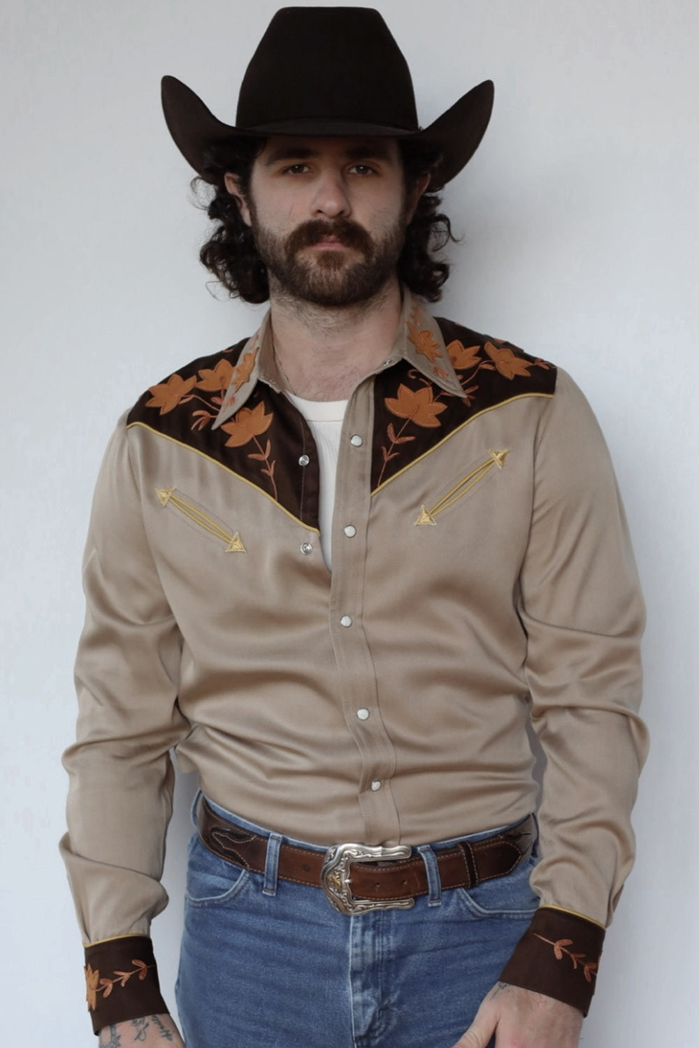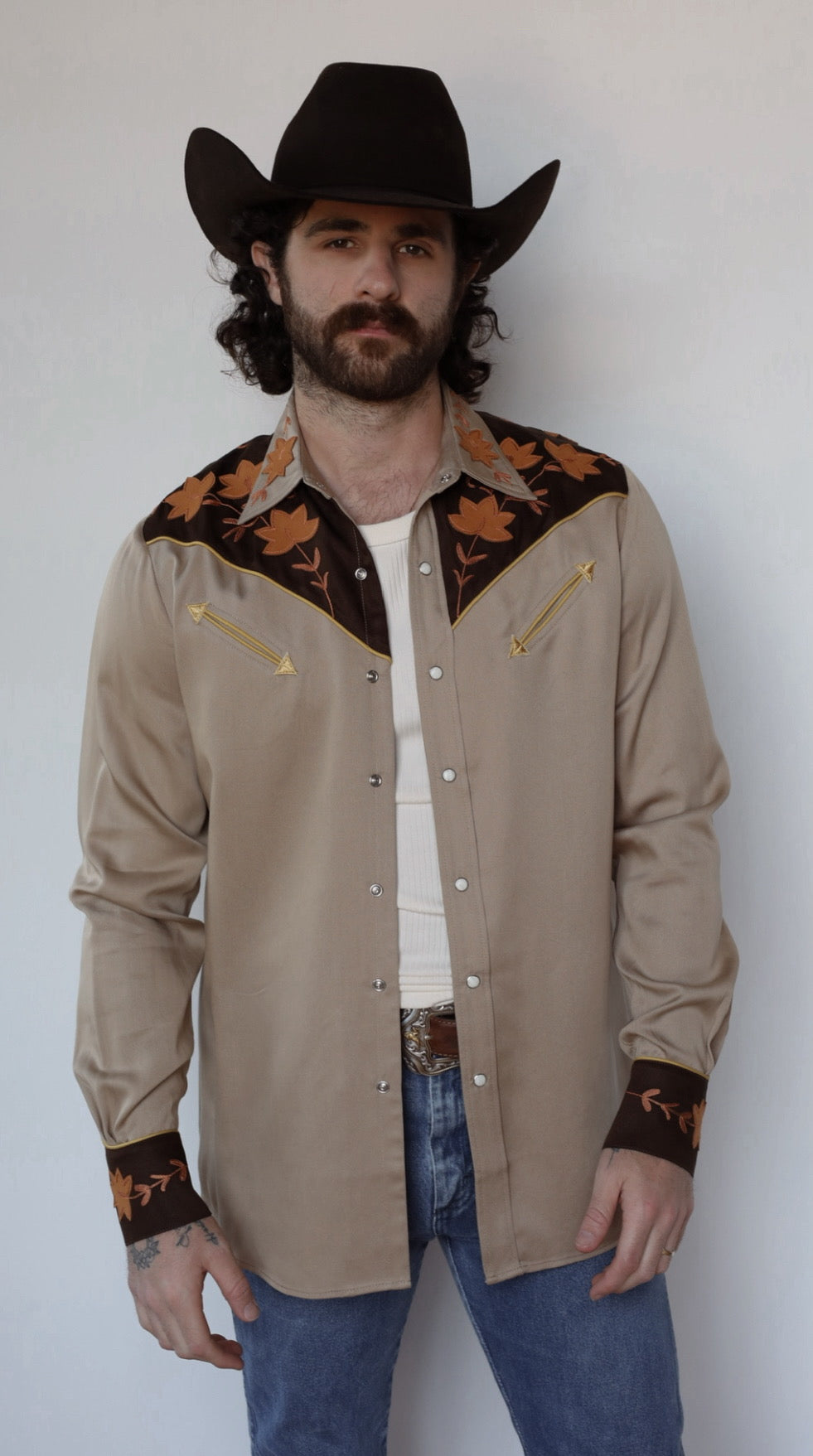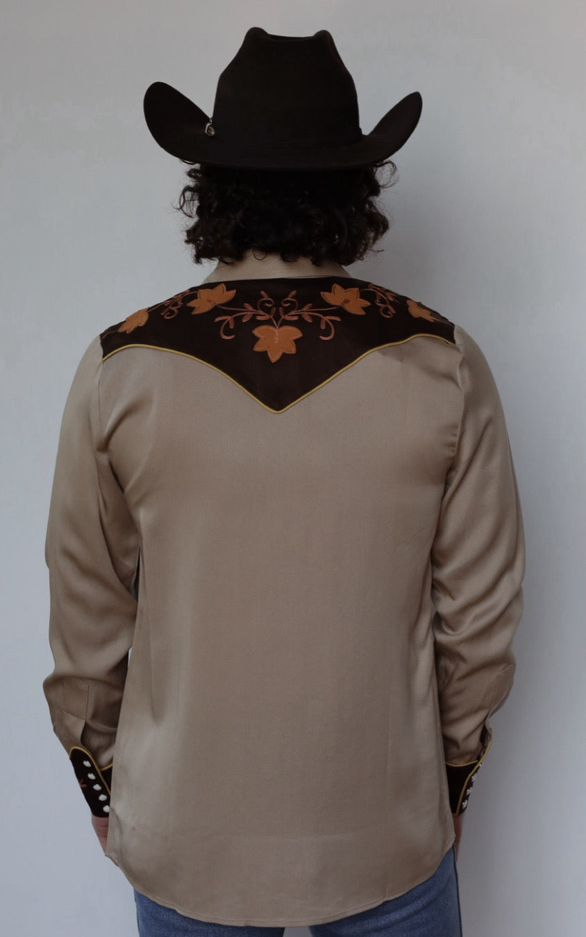 The Stowe Shirt brings together timeless Western design with earthy elegance. Its sandstone base is paired with a deep chocolate yoke and embroidered leaf detailing, creating a look that’s rooted in heritage and built to turn heads. Golden piping and signature arrow pockets complete the nod to classic rodeo style, with just the right amount of refinement.