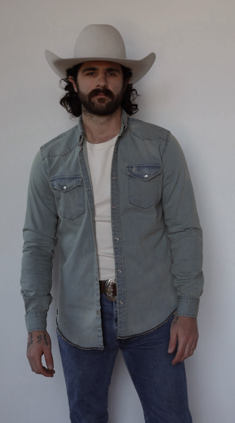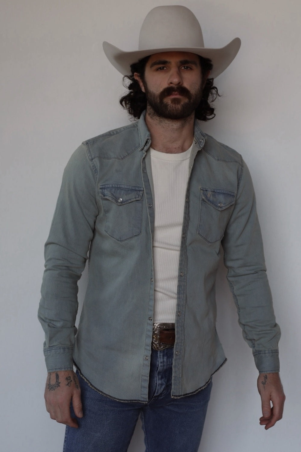 독점적인 기능- 진정한 테일러링, 평평한 솔기, 단일 바늘 스티칭, 새롭고 현대적인 실루엣, 시그니처 스냅 다운 칼라, 싱글 포인트 프론트 포켓 및 뒷면의 싱글 포인트 요크. 라운드 진주 스냅, 밑단의 해어진 밑단, 밑단의 빈티지 디테일.