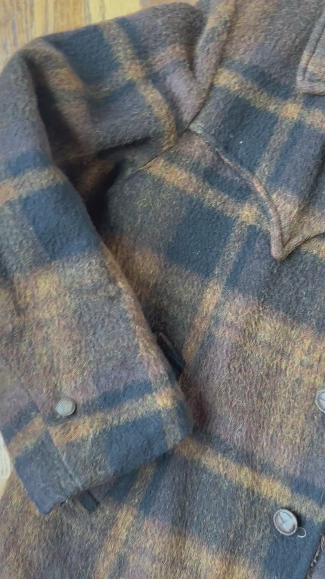 A striking men’s ranch-style coat from the 1960s, featuring a rich brown plaid exterior and a warm shearling lining. Finished with original vintage buttons and a beautifully constructed yoke, this piece embodies classic ranch life with timeless appeal.