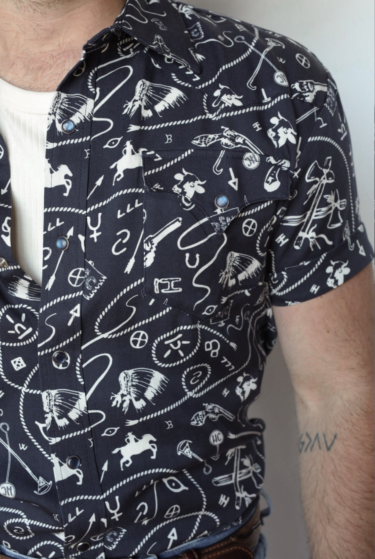 The Newport has single point front pockets, short sleeves, subtle yoke and pearl snaps.